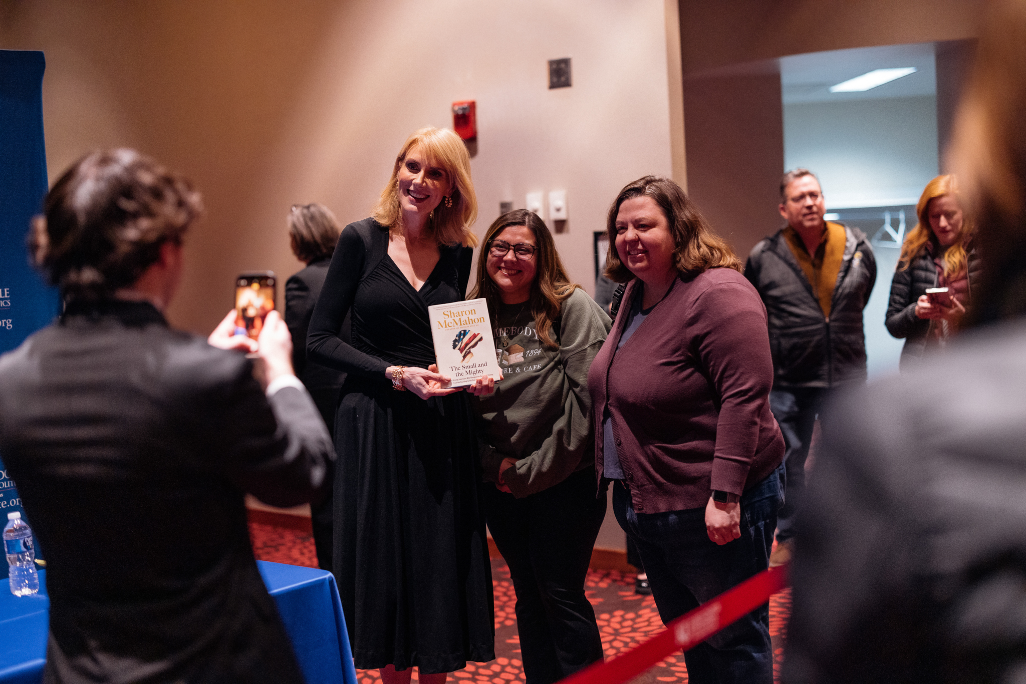 Public educator Sharon McMahon signs books and speaks with guests after the 2025 Elizabeth Dole Women in Leadership Lecture.