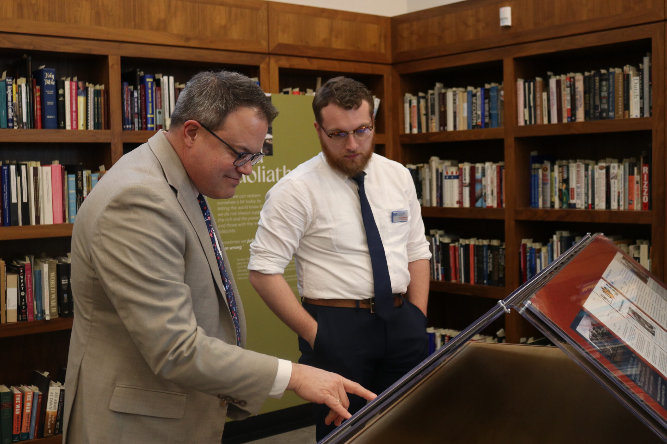 Assistant Archivist Alex Adelmund speaks with a guest viewing the newest special exhibit from the Dole Archives, "Dole & Dr. K."