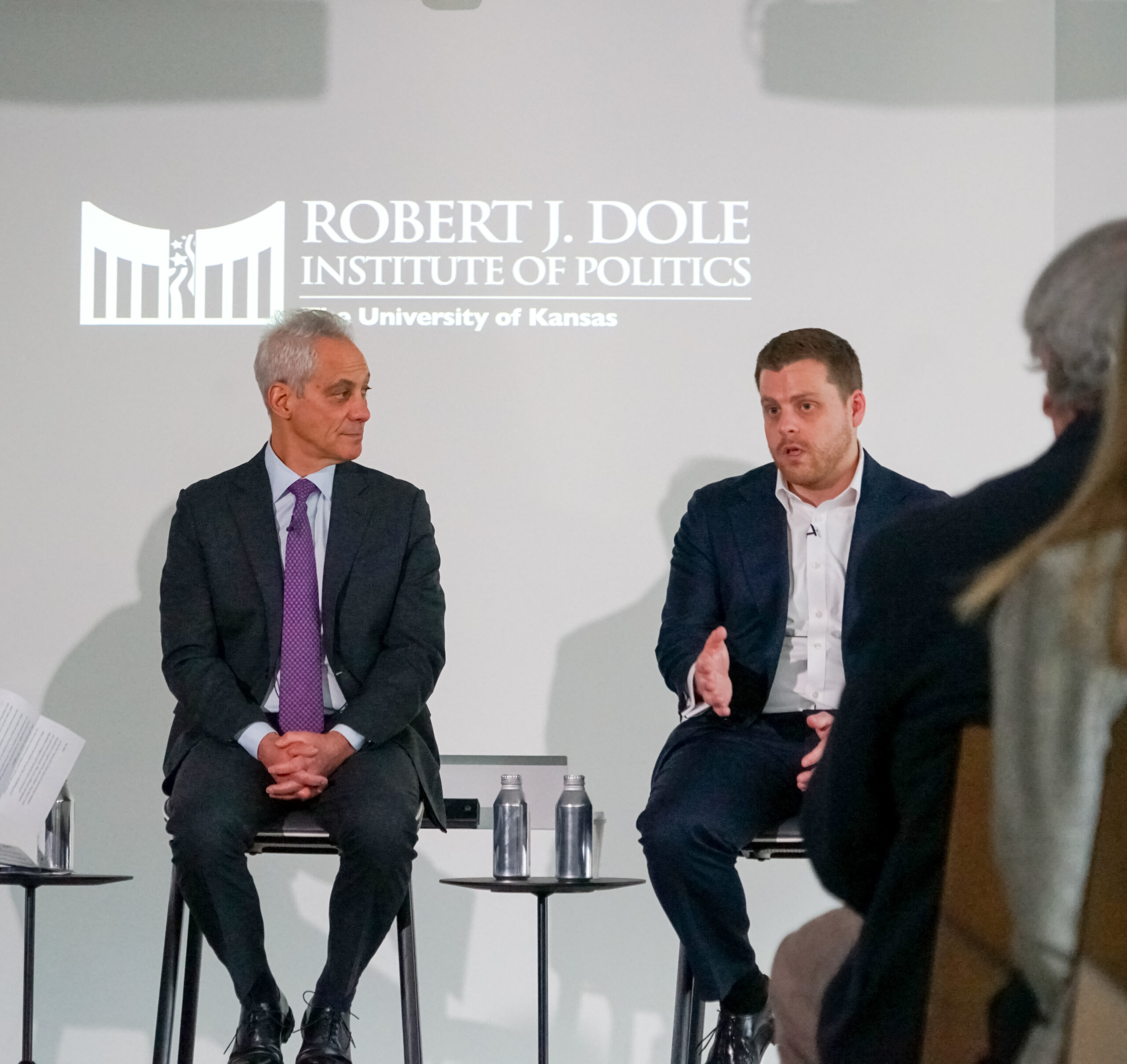 Obama White House Chief of Staff Rahm Emanuel and Trump '24 alum Alex Latcham speak at the first Dole Forum program in Washington, D.C.