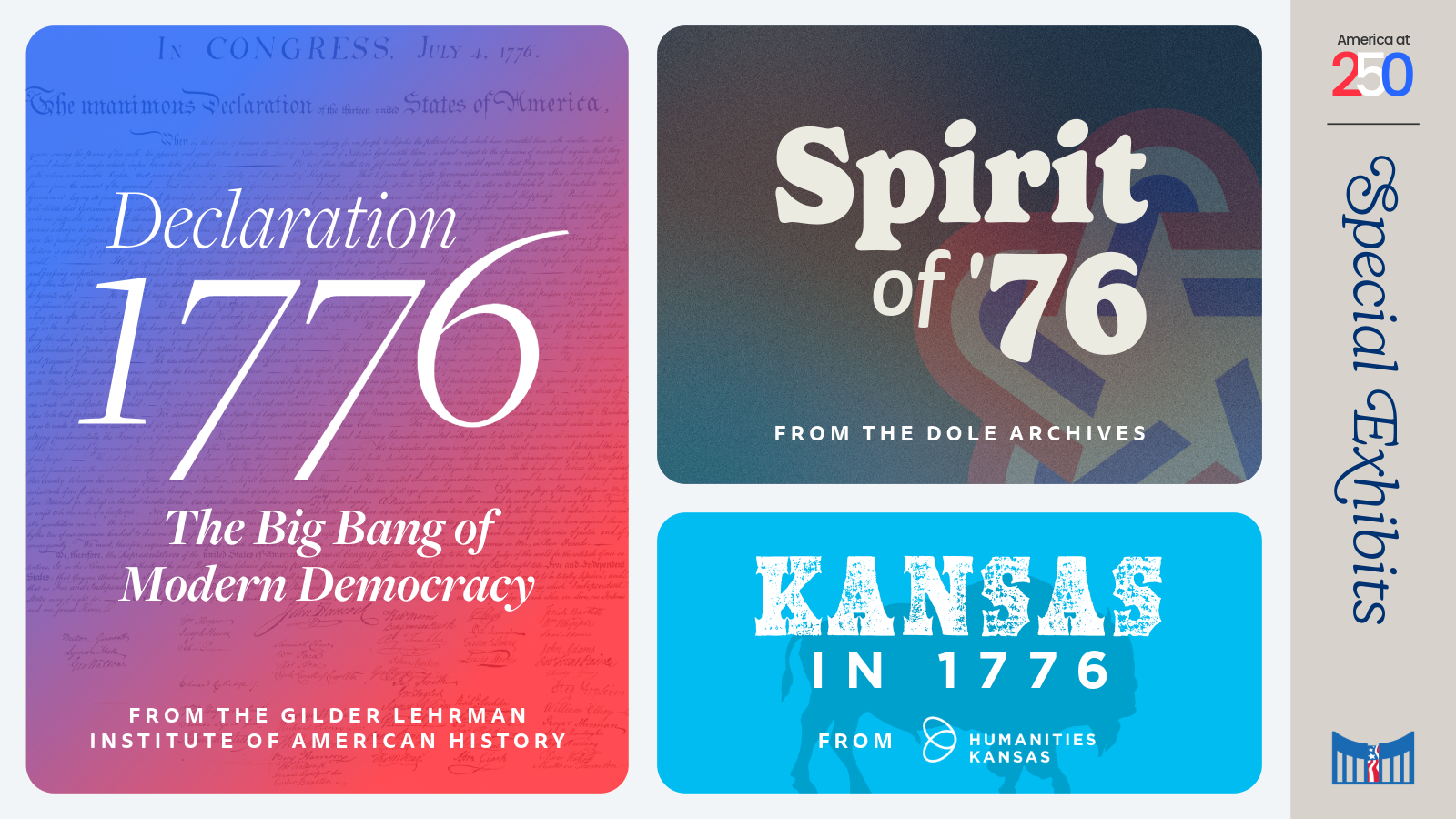 Commemorate America at 250 with three special exhibits highlighting the Declaration of Independence, Kansas, and the last major commemoration of America’s founding. Experience these special exhibits starting Feb. 16, on display in the Elizabeth Dole Gallery & Reading Room.