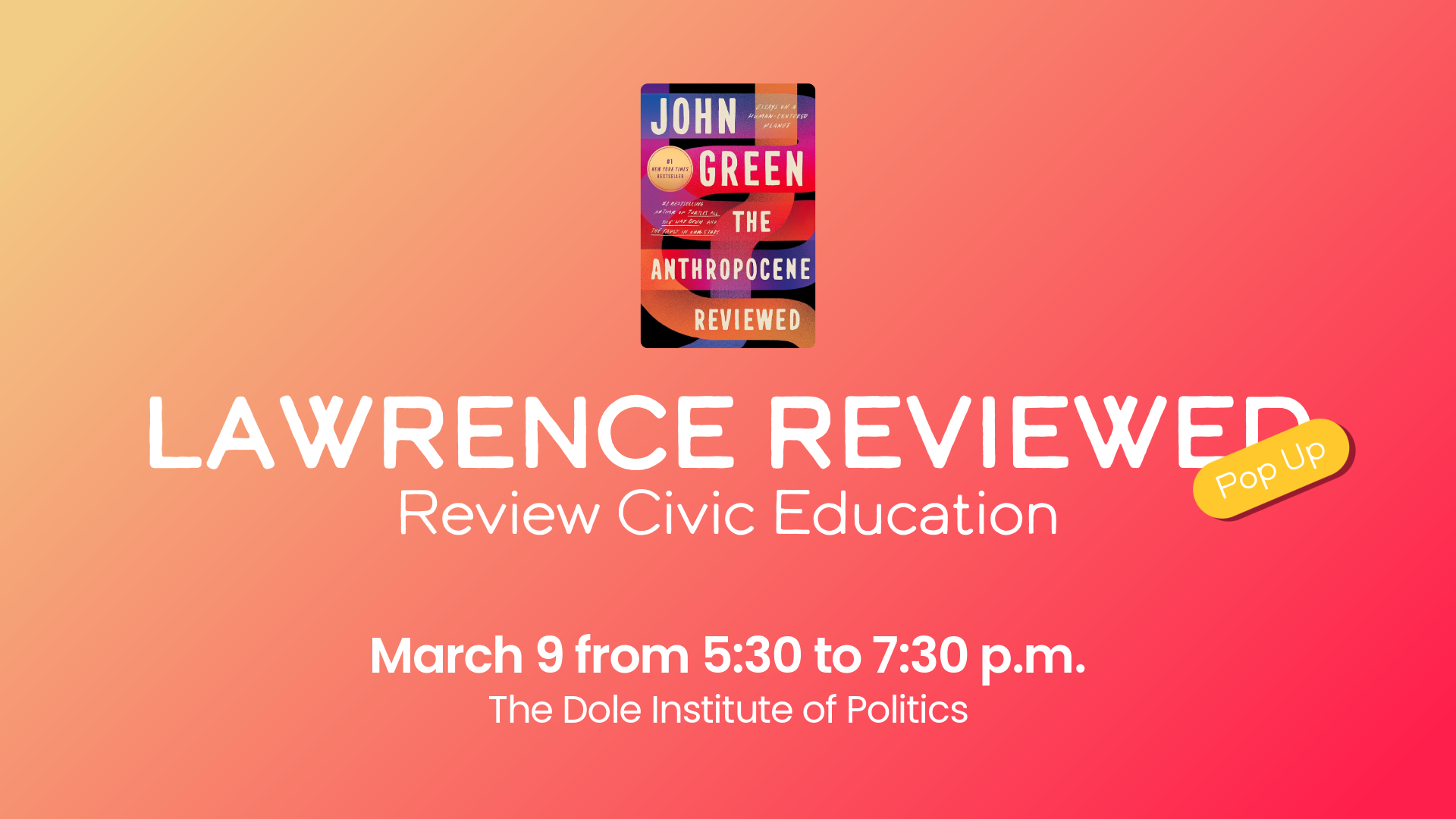 The Anthropocene Reviewed: Civic Education Edition invites students and community members to critically engage with their own local slice of the Anthropocene by contributing their own reviews, modeled by Green’s work. Stop by the Dole Institute of Politics on March 9 anytime from 5:30-7:30 p.m. to view our America at 250 Special Exhibits and explore our museum gallery. Also, see the World’s Largest Stained Glass American Flag Window as well as the September 11 Memorial.