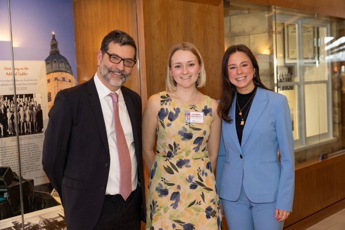 Student Advisory Board Coordinator Kenna McNally poses with Brinner guests Paul Haven of the Associated Press (left) and Lauren Green of the National Journal (right) ahead of the program. Photo by Ann Dean.