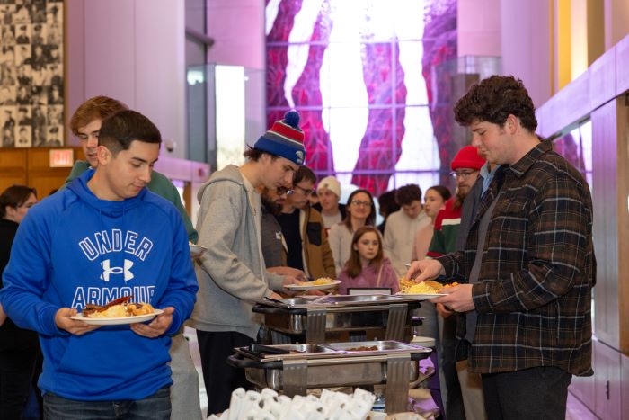 Students line up to enjoy the hallmark of Brinner – free breakfast for dinner. Photo by Ann Dean.