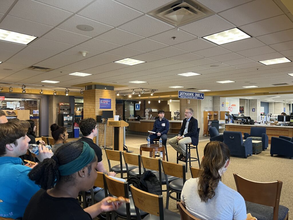 Students enjoy pizza as Chris Courtwright presents on Kansas tax and budget policy. Photo by Ella Rhuems.