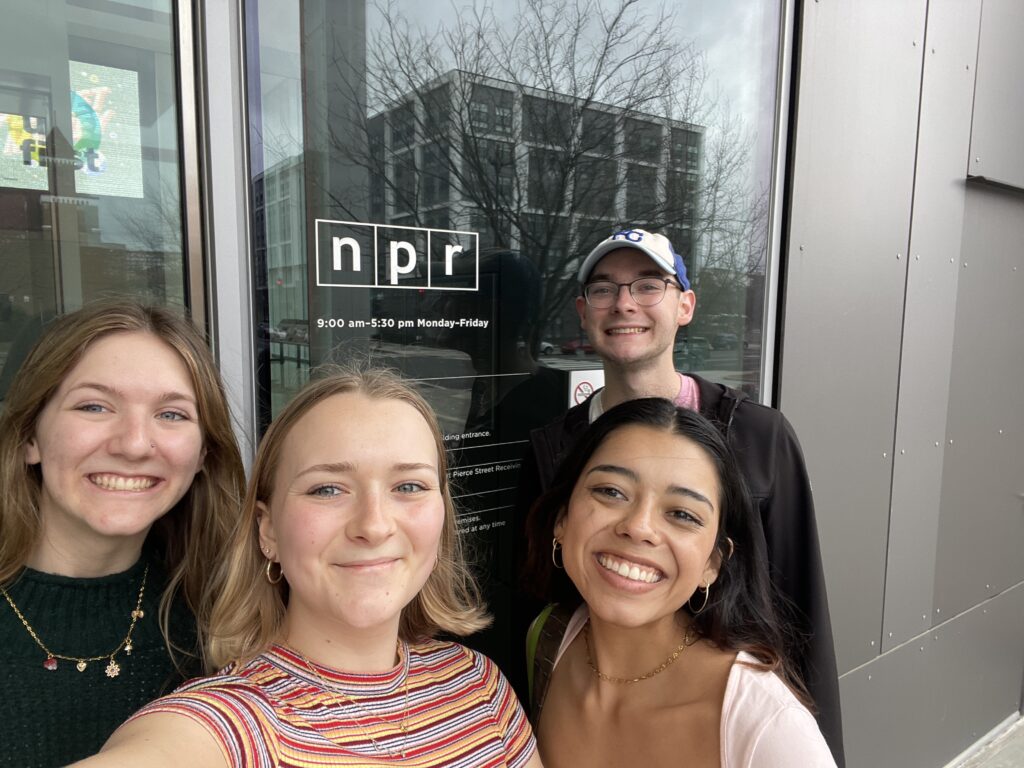 Abbie Clements, Kenna McNally, Arien Roman Rojas, and Cuyler Dunn pose for a photograph in front of the NPR headquarters in Washington, D.C. Photo by Kenna McNally.