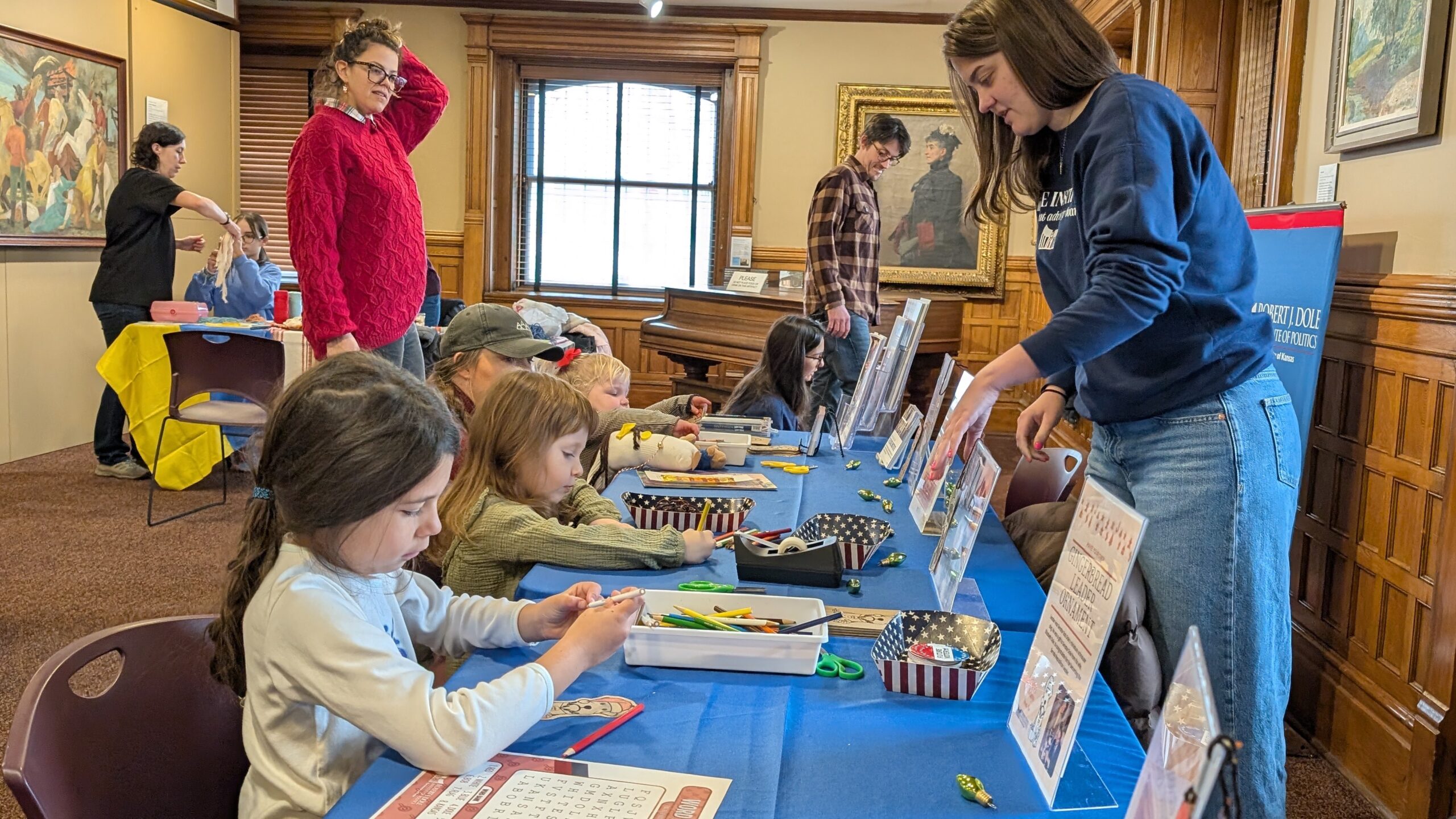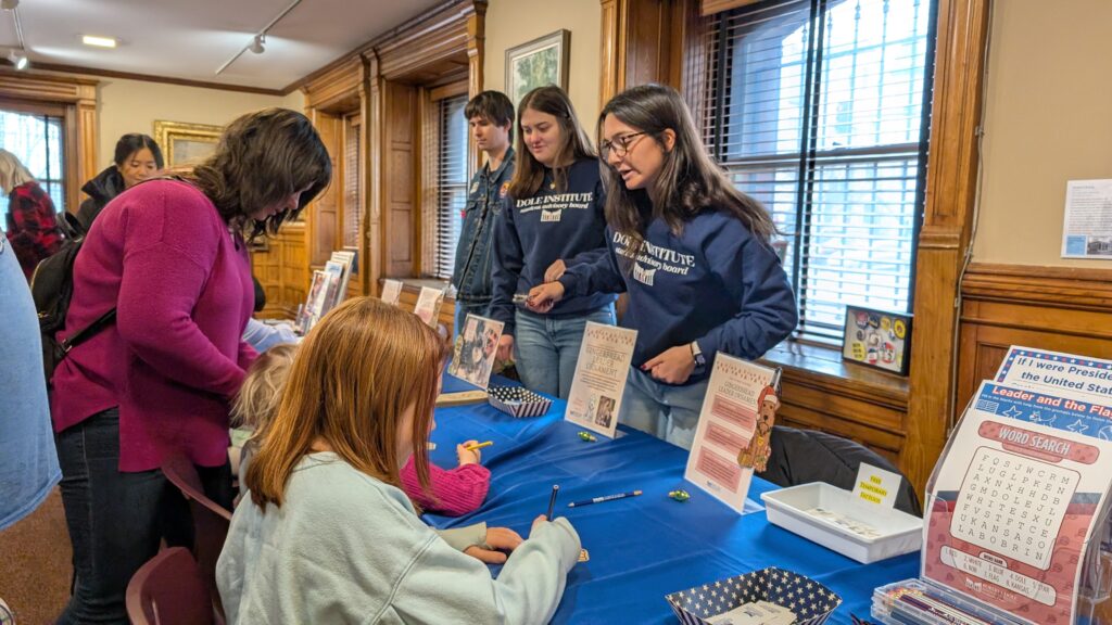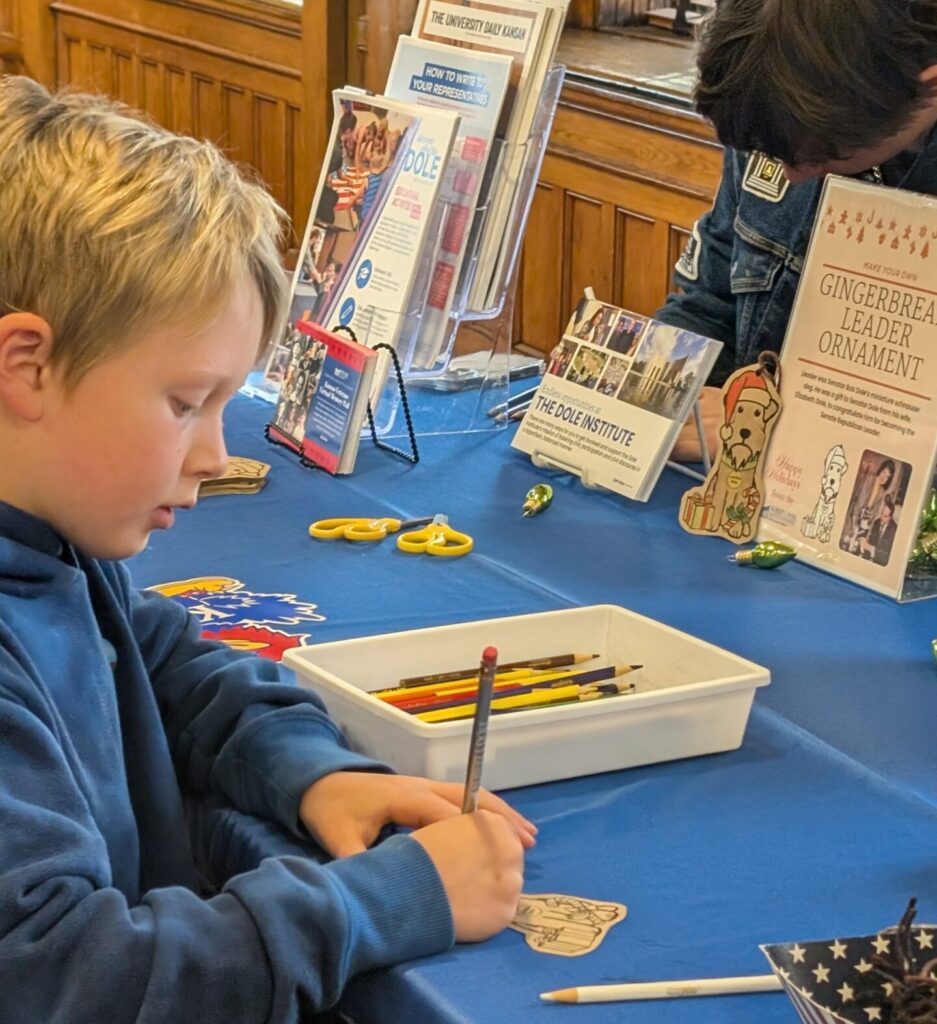 December 6, the Dole Institute of Politics hosted an activity table at the Watkins Museum of History’s 12th annual Tails and Traditions Holiday Festival. This annual family-oriented event brings together other KU organizations, including the Spencer Museum of Art, KU Museum Studies, KU Center for East Asian Studies, and the Center for Russian, East European, and Eurasian studies. Public Education Director Julie Clover and three Dole Institute Student Advisory Board members – Alexandra Reiland, Cami Chaffin, and Solomon Geoffrey – represented at the Dole Institute table, promoting its mission among young visitors.