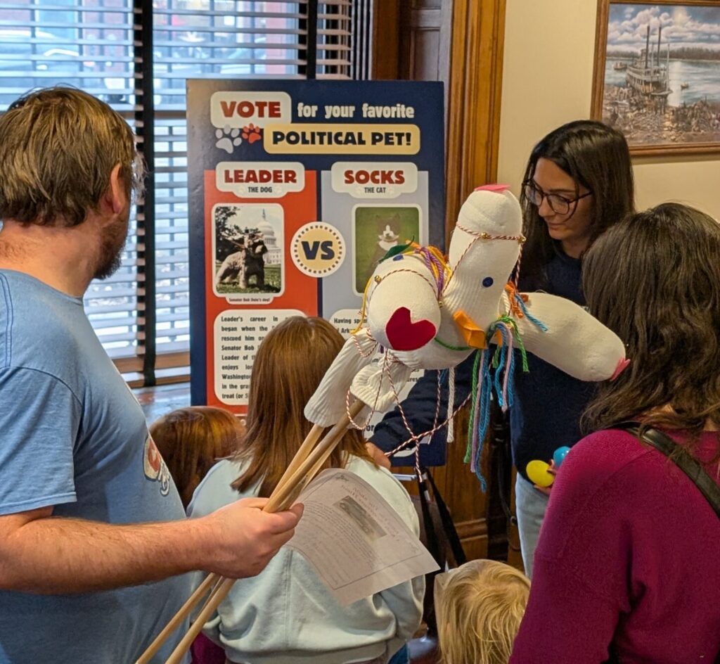 Senators Bob and Elizabeth Dole were very fond of their rescue miniature schnauzer pup named Leader, a DC rescue animal celebrating Senator Dole’s Majority Leader status. To teach civic engagement, mimicking the 1996 presidential election, families participated in a very important democratic election – using a plastic egg to cast their ballot for their favorite political pet between Leader the dog (Senator Dole’s dog) or Socks the cat (President Clinton’s cat). Echoing the actual 1996 election outcome, President Clinton “emerged victorious again” as Socks the cat secured the popular vote over Leader.