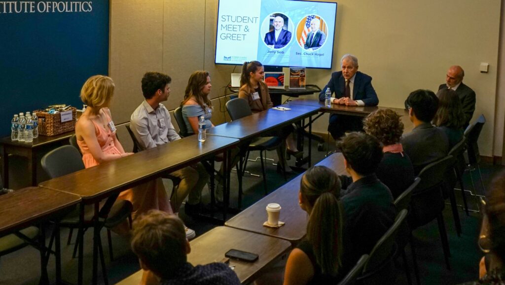 Students attend an exclusive Student Meet & Greet with former U.S. Secretary of Defense Chuck Hagel and Visiting Dole Fellow and former Washington Editor of the Wall Street Journal Jerry Seib.
